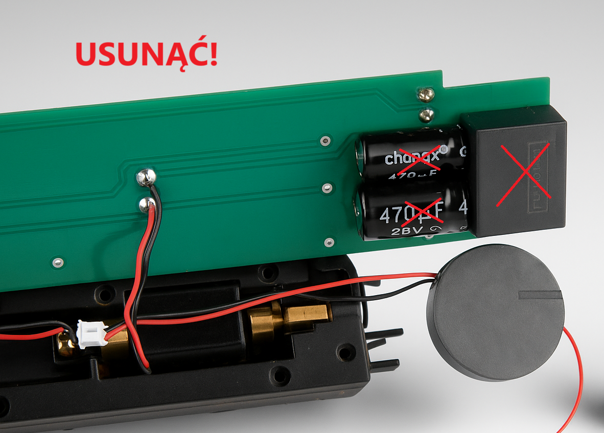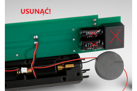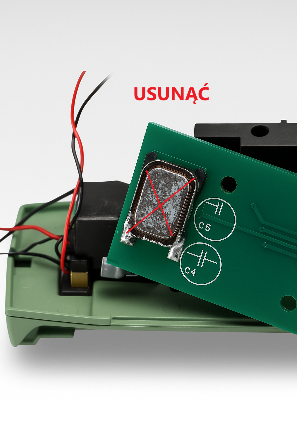 Aby uzyskać najlepszy dźwięk, należy usunąć dwa kondensatory oraz głośnik z płytki i zastąpić je głośnikiem SM427498 z modelcenter.pl (patrz zdjęcia). Plik dźwiękowy jest doskonale dopasowany do tego głośnika.