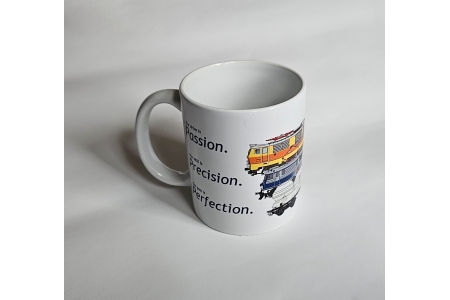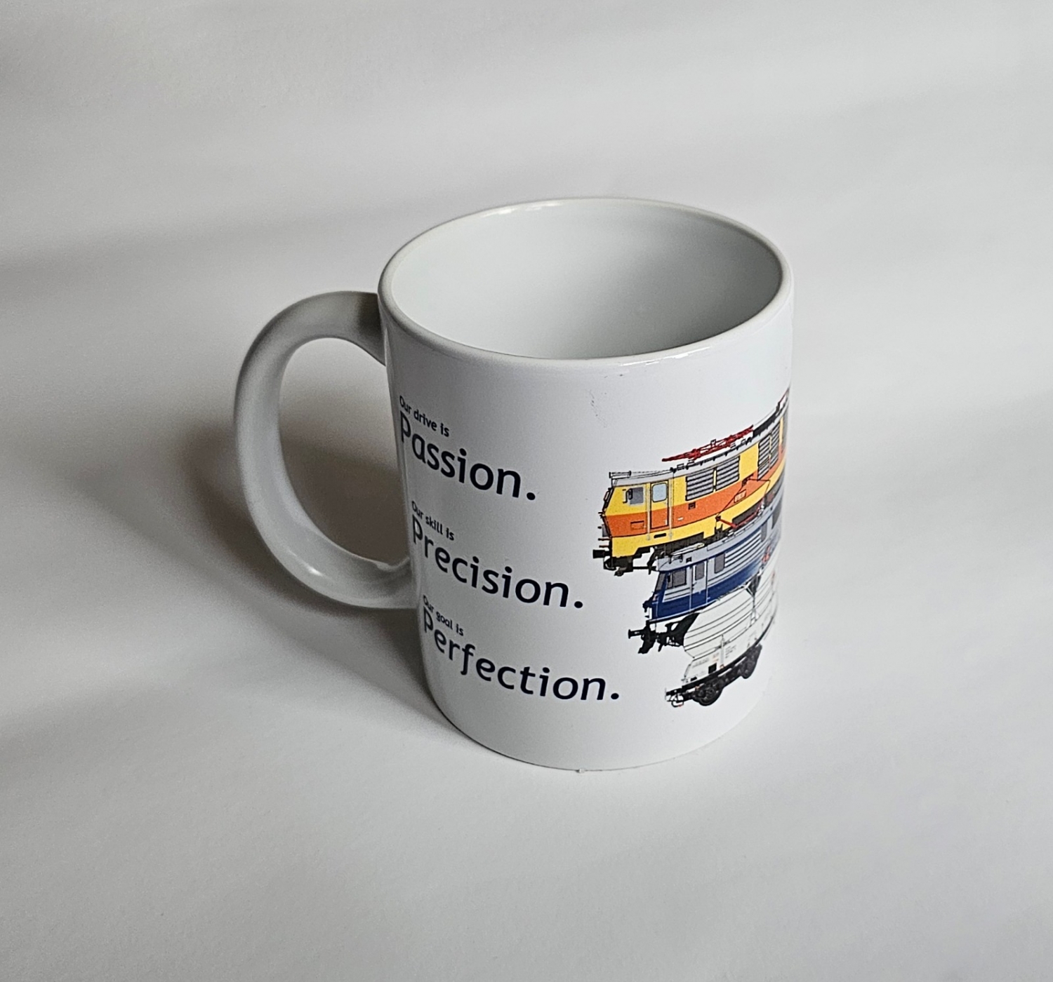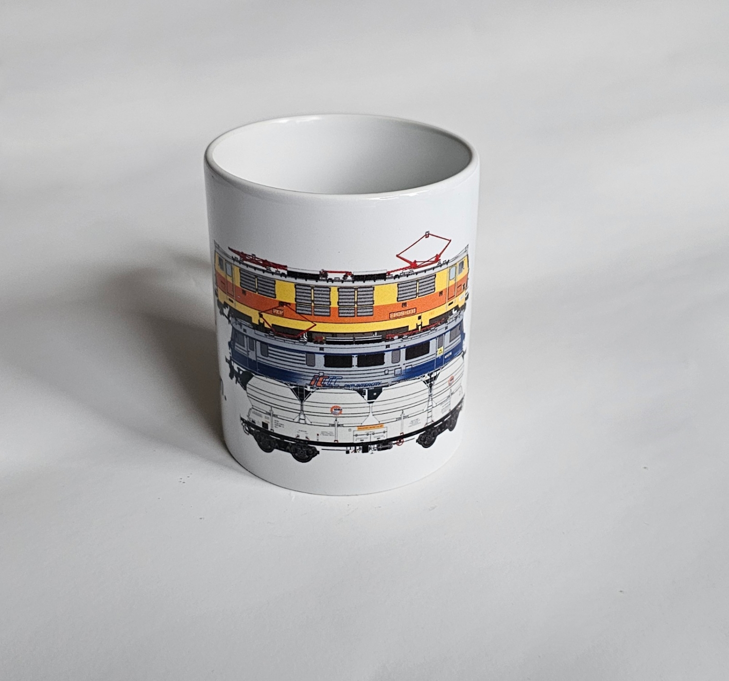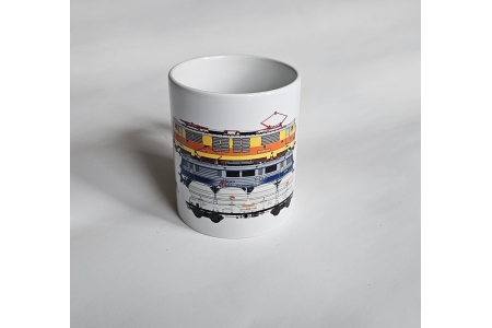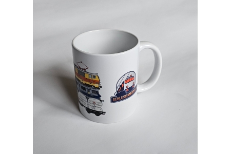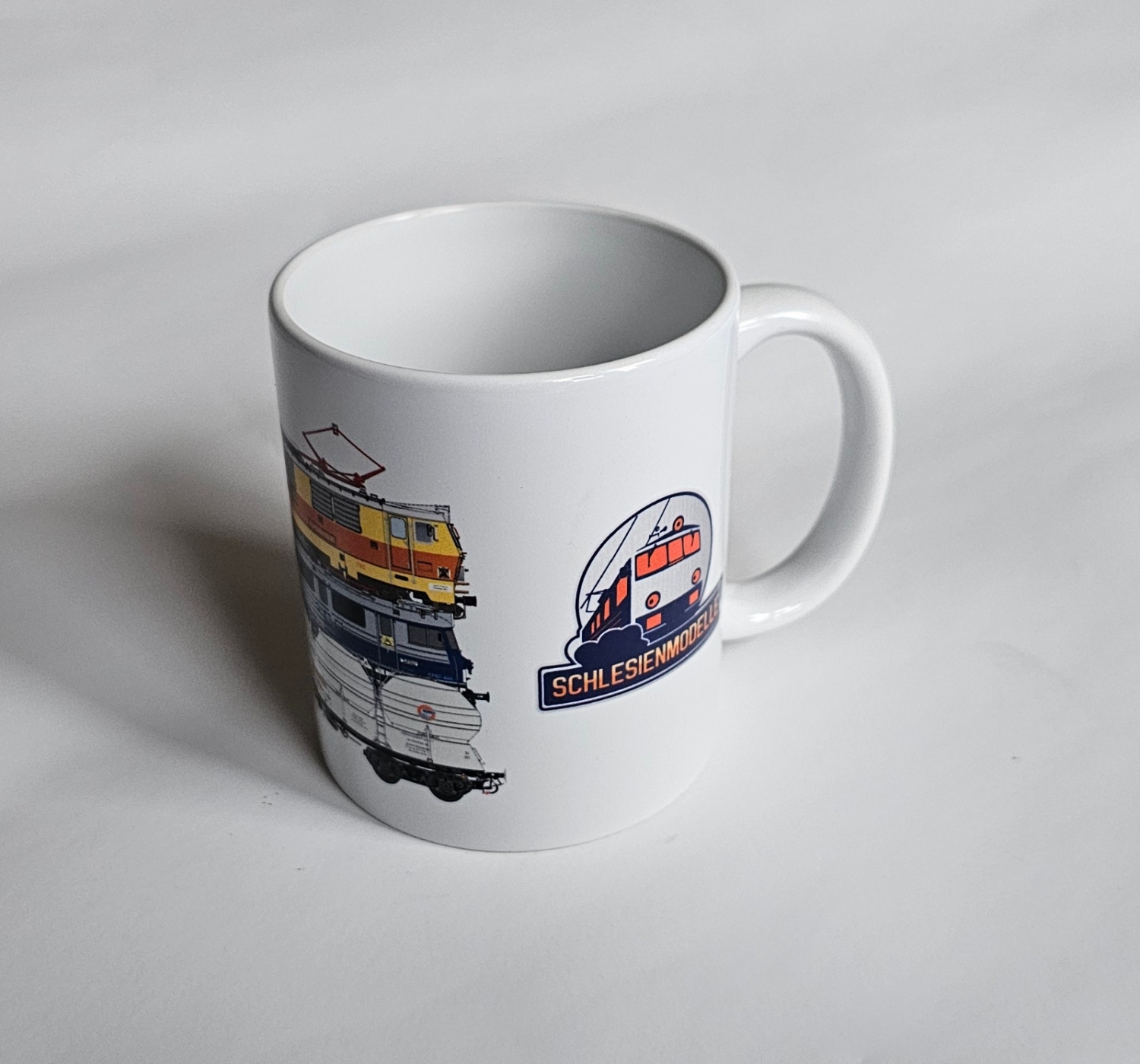 Kubek z nadrukiem marki Schlesienmodelle, idealny dla miłośników kolei i modelarstwa.