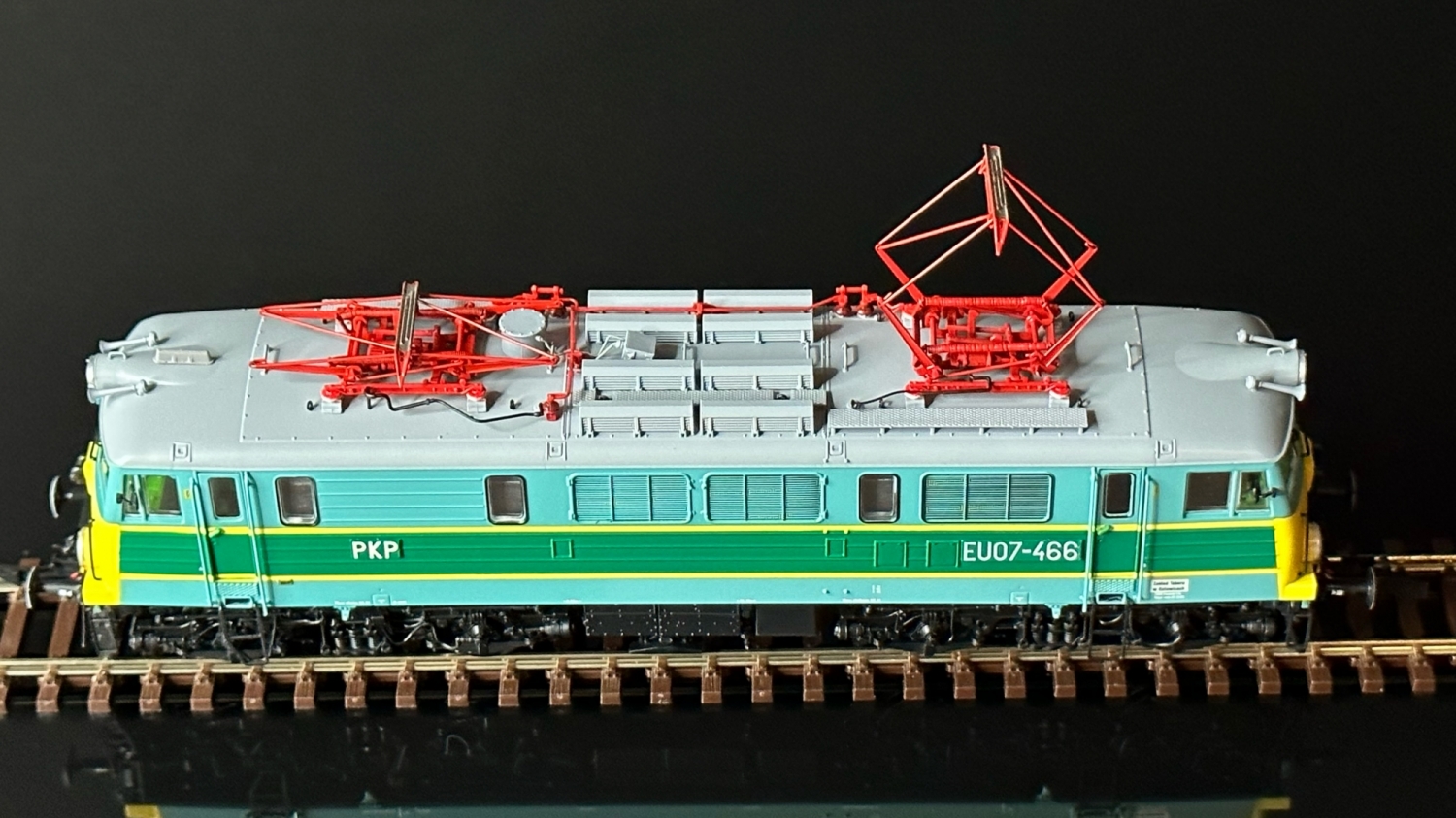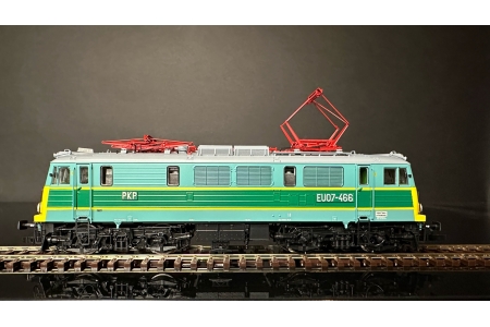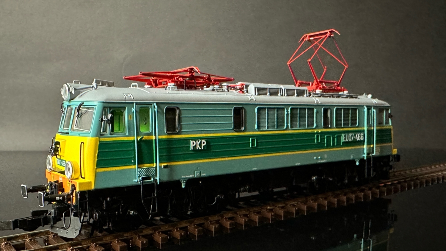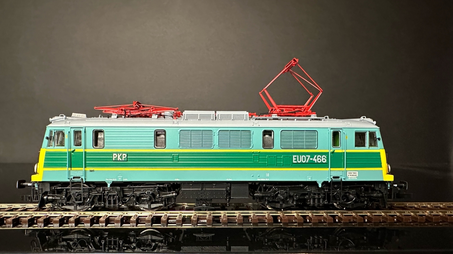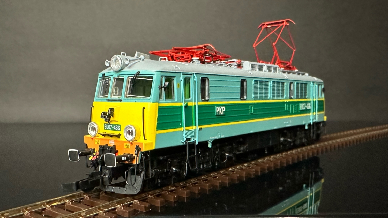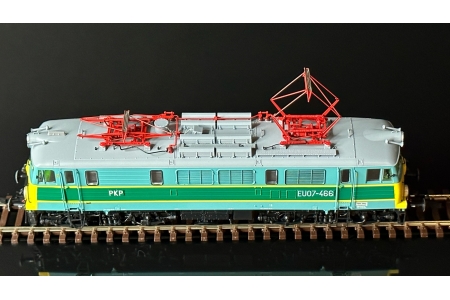 Model lokomotywy EU07-466, w najbardziej charakterystycznym w drugiej połowie lat 90-tych schemacie malowania tej serii lokomotyw.