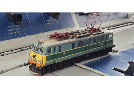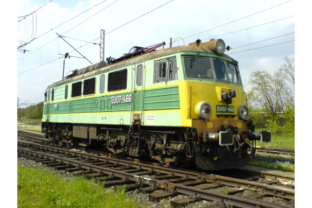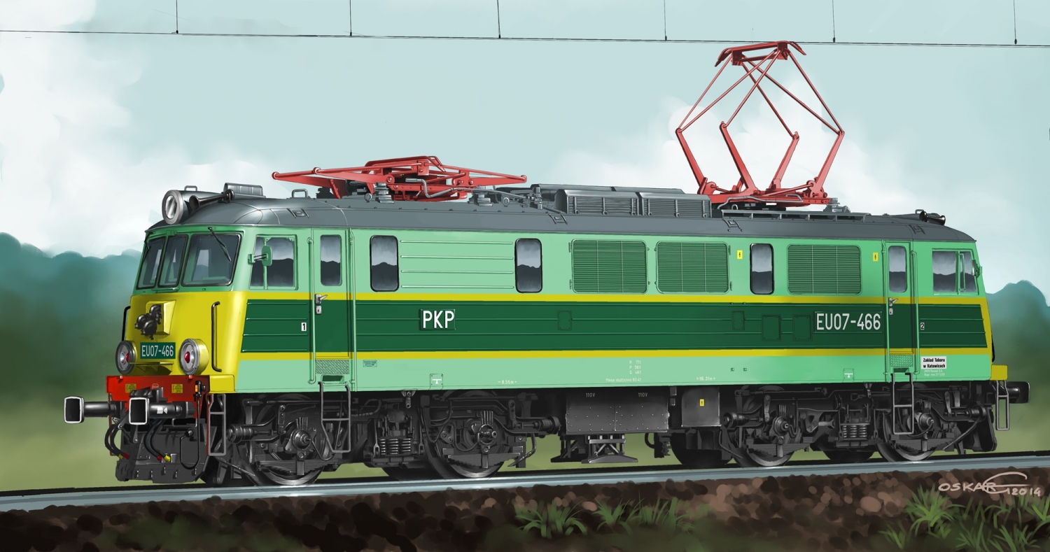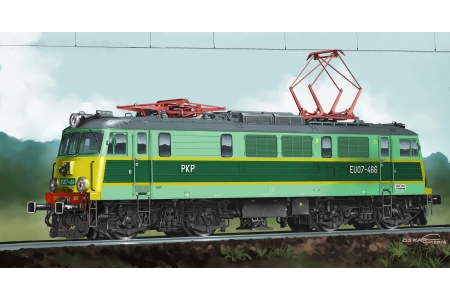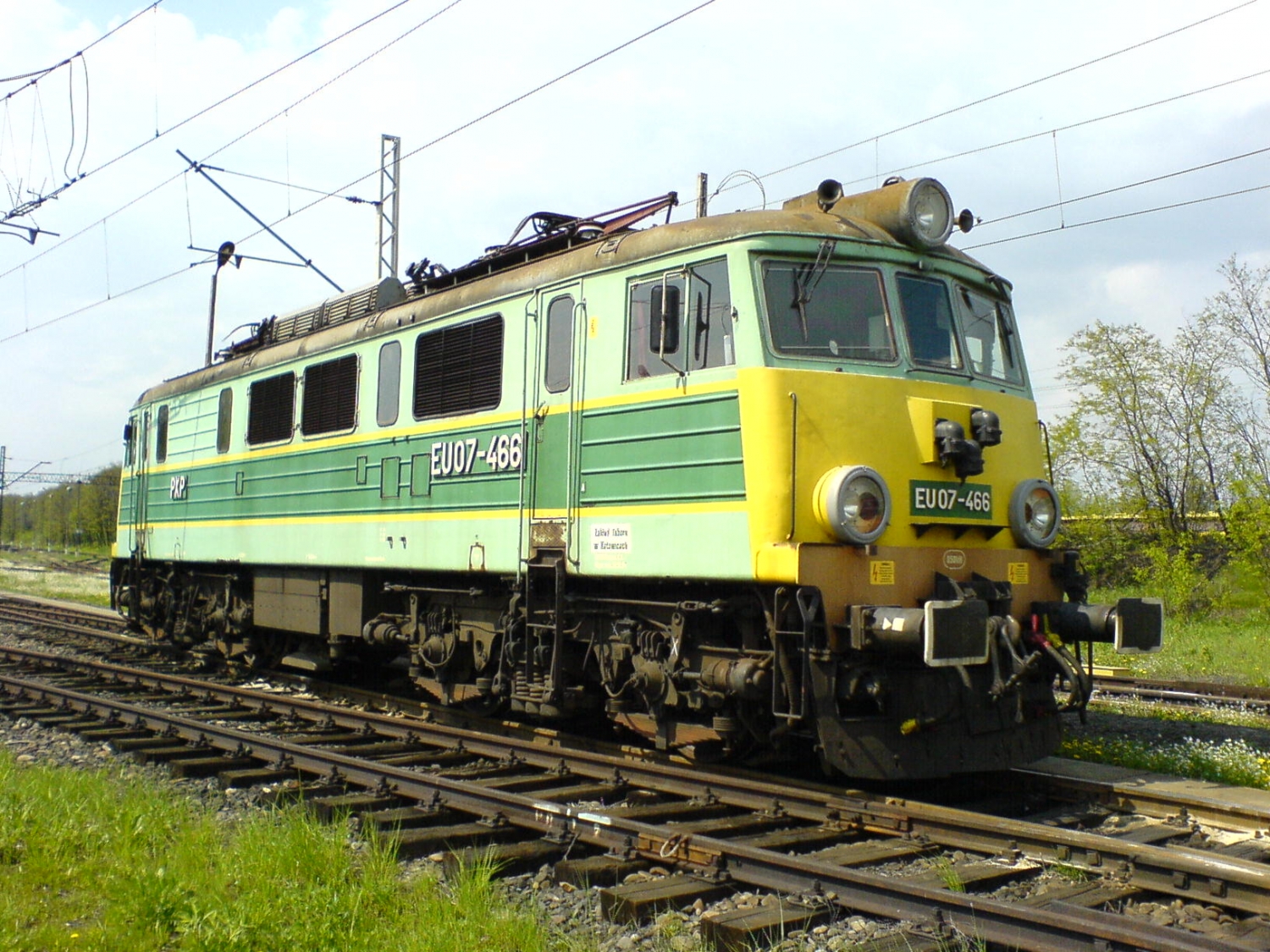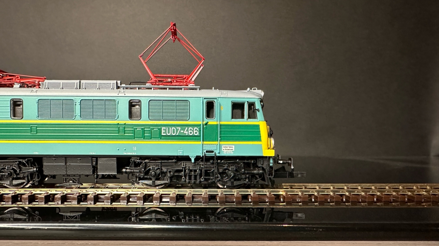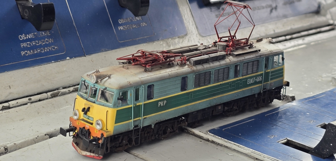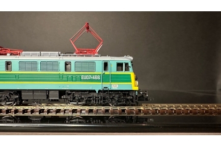 Model lokomotywy EU07-466, w najbardziej charakterystycznym w drugiej połowie lat 90-tych schemacie malowania tej serii lokomotyw.