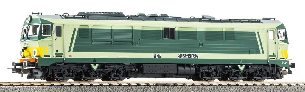Model spalinowej lokomotywy SU46-037 w barwach PKP MT. Żagań.