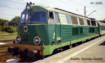 Model lokomotywy spalinowej SU45 w barwach PKP, z Epoki V. SU45 to klasyczna lokomotywa manewrowo-liniowa, szeroko wykorzystywana w Polsce do prowadzenia pociągów pasażerskich i towarowych na średnich i długich trasach.