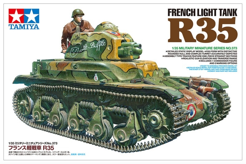 Model plastikowy do samodzielnego montażu przedstawiający francuski czołg lekki Renault R35, używany podczas II wojny światowej. Zestaw zawiera szczegółowe elementy kadłuba, wieży, gąsienic oraz figurkę załogi. Model wymaga użycia kleju i farb (nie dołączono).