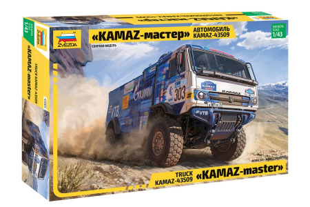 Plastikowy model do sklejania przedstawiający rajdową ciężarówkę KamAZ‑43509 „KamAZ‑Master” w skali 1:43. Model wiernie oddaje sylwetkę pojazdu rajdowego, w tym kabinę, nadwozie, zawieszenie oraz szczegóły podwozia. Zestaw zawiera 195 precyzyjnych części, kalkomanie oraz instrukcję montażu.