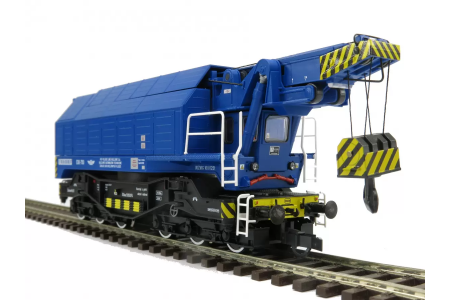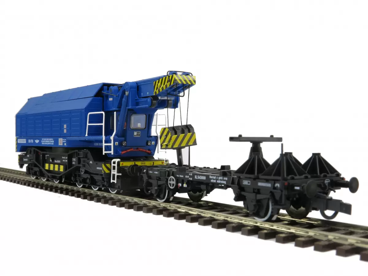 Model kolejowego dźwigu obrotowego EDK 750 XUaa w skali H0 (1:87) – profesjonalnego pojazdu szynowego wykorzystywanego przy pracach załadunkowych, rozładunkowych oraz przy obsłudze towarów ciężkich na bocznicach i terminalach kolejowych.