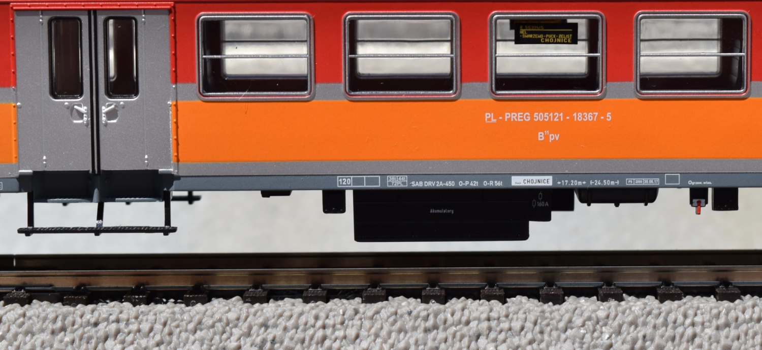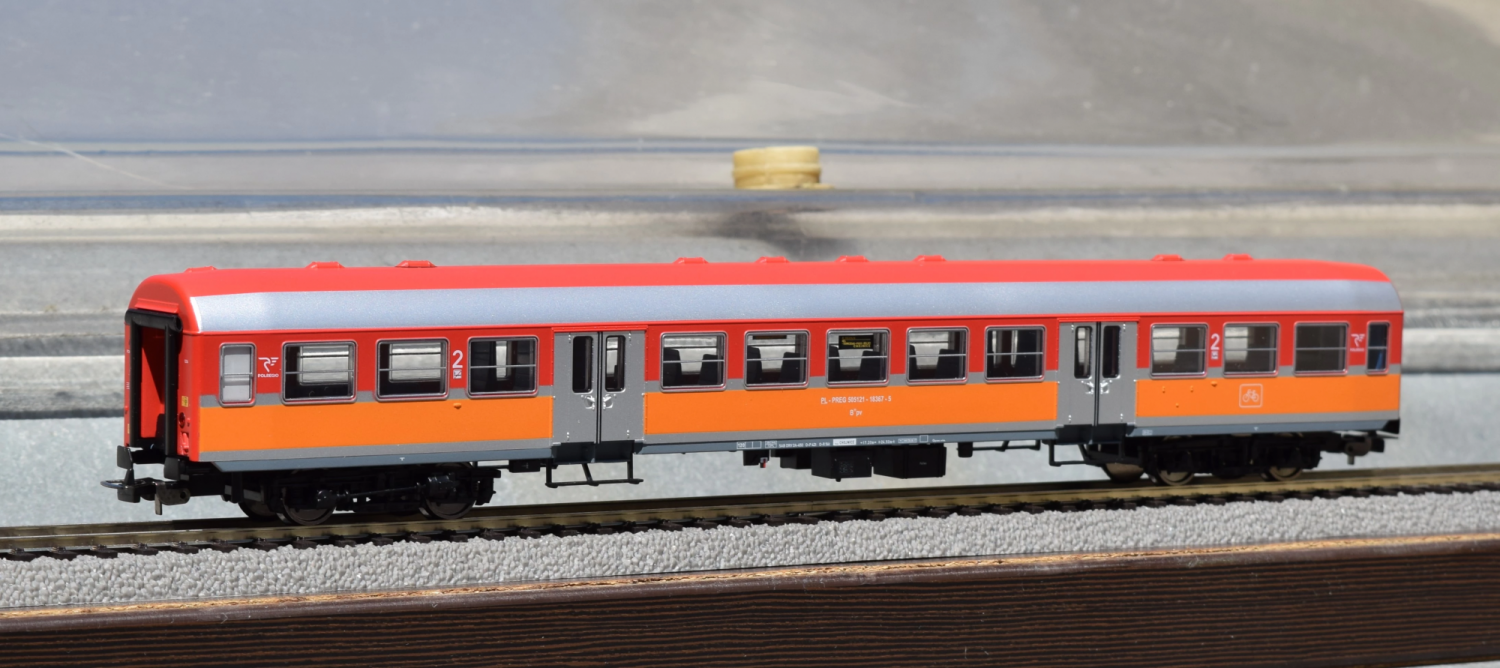 Model wagonu pasażerskiego 2 klasy typu 120A w malowaniu POLREGIO. Wagony tej serii, wywodzące się z rodziny zmodernizowanych wagonów standardu Y, były wykorzystywane w ruchu międzyregionalnym oraz dalekobieżnym po reorganizacji rynku przewozów pasażerskich w Polsce.