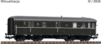 Model wagonu pocztowego w barwach PKP, z Epoki III. Wagony pocztowe tego typu były wykorzystywane do przewozu przesyłek i listów w ruchu pasażerskim, stanowiąc nieodłączny element przedwojennej logistyki kolejowej.