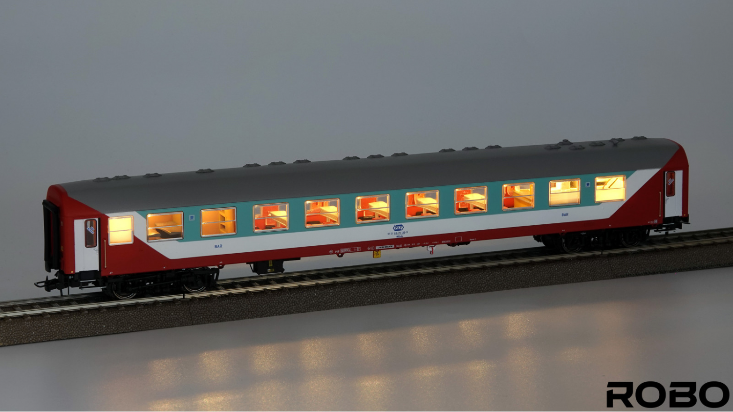 Model wagonu barowego w malowaniu PKP.