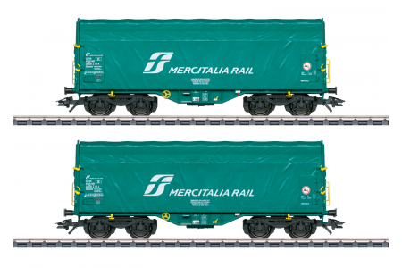 Dwa wagony towarowe Mercitalia Rail S.r.l. (Rzym), typ Shimmns 4-osiowe wagony z przesuwanym plandeką, producent Greenbrier (Świdnica). Wagony wyglądają tak, jak wyglądały około 2019 roku.