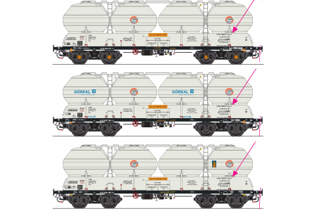 Zestaw trzech czteroosiowych wagonów specjalnych typu 408S (seria Uacs) należących do GÓRKAL.