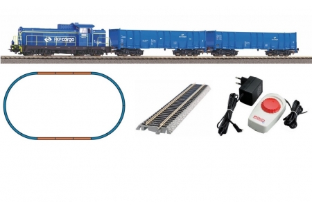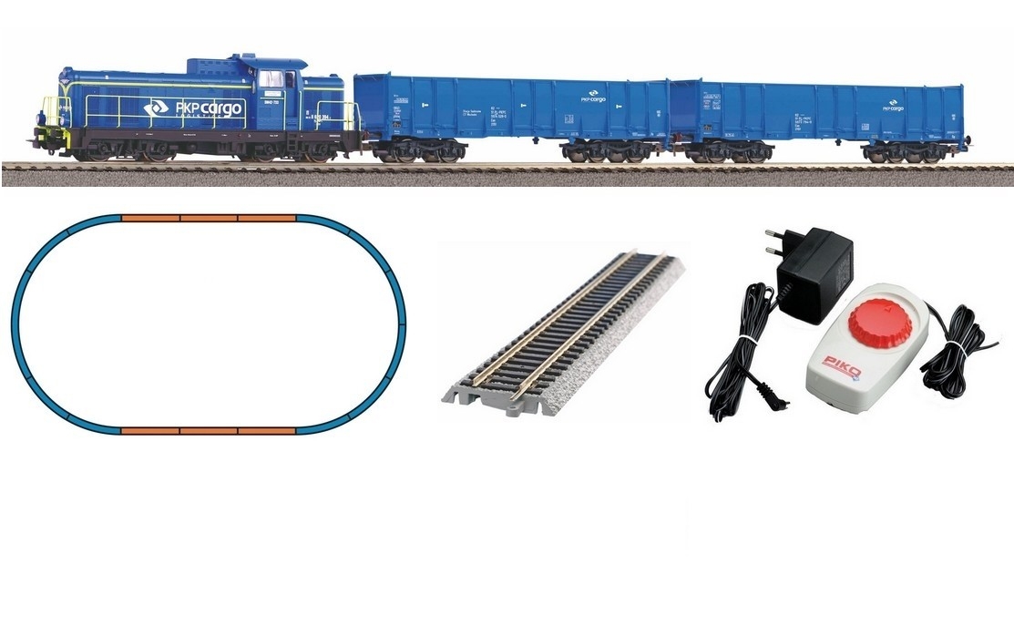 Zestaw startowy w skali H0 (1:87) przedstawiający współczesny pociąg towarowy w barwach PKP Cargo.