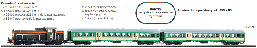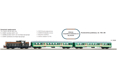 Model zestawu obejmującego lokomotywę spalinową SP42 wraz z dwoma wagonami 120A w barwach PKP, z Epoki V. SP42 to klasyczna lokomotywa pasażerska, szeroko wykorzystywana w Polsce do prowadzenia składów lokalnych i dalekobieżnych. Wagony 120A to historyczne wagony pasażerskie, zapewniające komfortowy przewóz pasażerów.