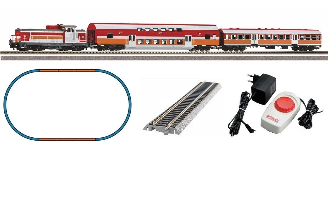 Zestaw startowy w skali H0 (1:87) przedstawiający skład pasażerski w barwach POLREGIO z epoki VI. W zestawie znajduje się lokomotywa spalinowa SM42 oraz dwa wagony pasażerskie – wagon piętrowy i wagon typu 120A.