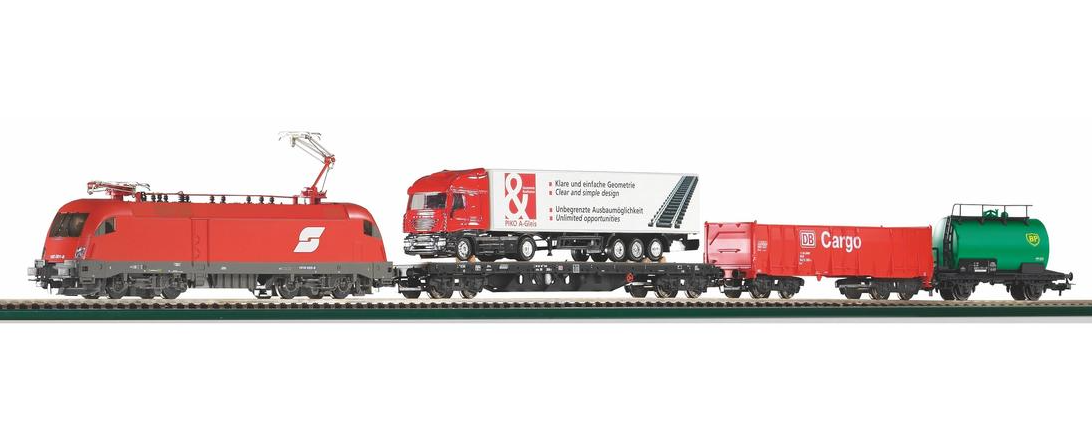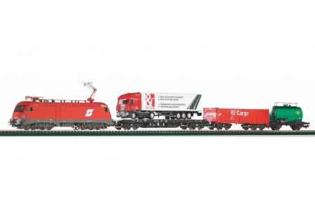 Zestaw startowy z lokomotywą elektryczną Siemens ES64U2 (Taurus) w barwach ÖBB oraz trzema wagonami towarowymi.